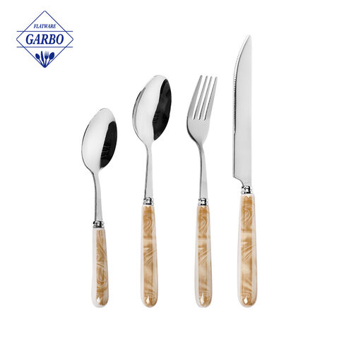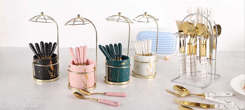 The highlight of this flatware set is the ceramic handle, which adds a unique and luxurious element to each piece. The ceramic handles are available in various eye-catching designs, ranging from intricate patterns to contemporary motifs. The handles are adorned with golden painting, creating an opulent and sophisticated appearance that will captivate guests and enhance the overall dining experience.