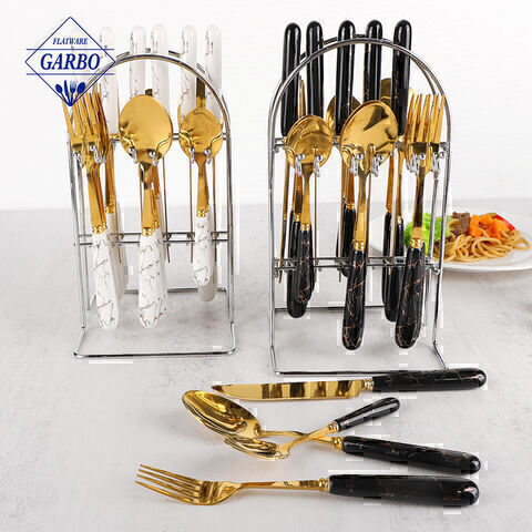 Elegant Designs: A PVD gold cutlery set with a marble design and black ceramic handle is a luxurious and elegant addition to any dining experience. The PVD gold coating ensures the cutlery will resist tarnishing and retain its brilliant shine for years to come. The marble design on the handles provides a unique and modern twist, while the black ceramic handle offers a comfortable grip and a stylish contrast.