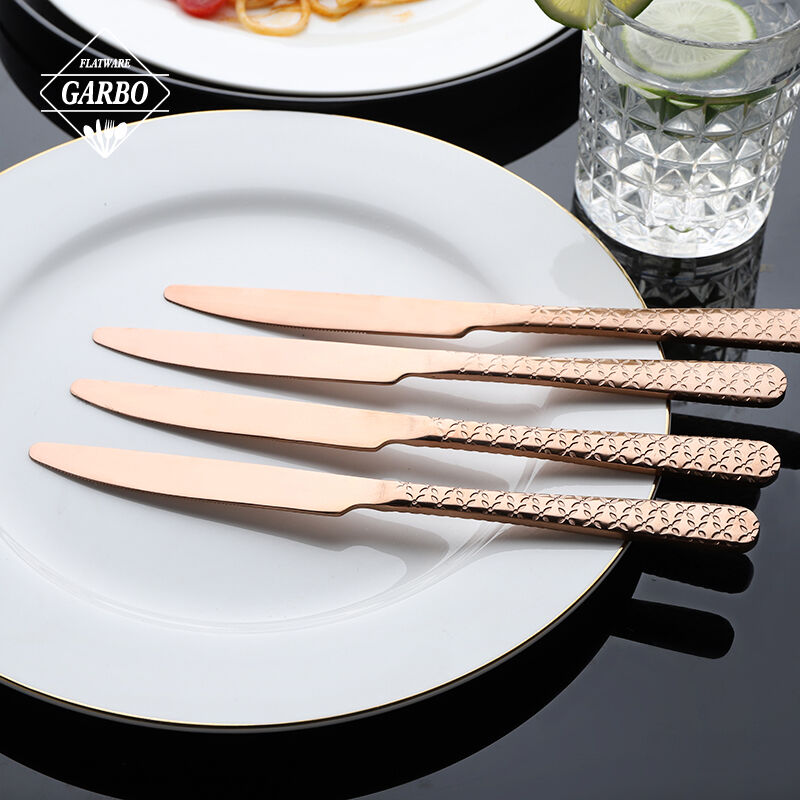 Whether you're hosting a dinner party, holiday gathering, or any other special occasion, this special copper rose gold color 420 stainless steel dinner knife with leaf clover handle is the perfect choice. Its elegant design and premium quality will impress your guests and elevate your dining experience to the next level.
