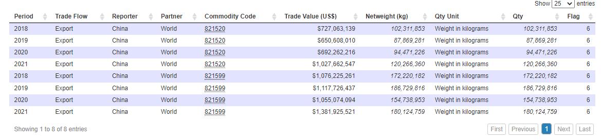Let’s see some export data, we can check from comtrade.un.org, China's export of stainless steel cutlery keeps rising, and even with the Covid-19 effect, the demand for table flatware from China is raise a lot. We can check the data cutlery, and cutlery set, with the HS codes: 821520 and 821599, the data was raised obviously from 2020-2021.