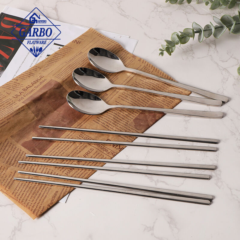 As we all know that for the stainless steel flatware set, normally it doesn’t contain the chopsticks. However, due to cultural differences and eating habits, people in some regions need to use chopsticks when dining, especially in Southeast Asia. In order to meet the needs of our customers from different regions, we also have stainless steel cutlery sets with chopsticks. Lets take the following flatware set as an example. Silver mental flatware set is the most common eating utensils. For this flatware set, it is made of the premium 304 stainless steel, the best material of the flatware. And this flatware is very durable, 304 stainless steel is anti-rust so that the flatware can be used for a long time. What a practical cutlery set! The design for this flatware set is very simple but classic. It is the one of the best choices of the flatware for home use.