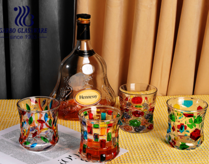 It's also a good choice to send your friend the unique hand painted whiskey glass cup. Apart from pure liquor whisky or any other beverage serving, these glass cups are also a fancy tabletop decoration for home or barware shelf. The common post processing methods include color spraying, screen printing, decal printing and pure handmade painting craft as shown here. That makes the glass cup such luxury and unique.