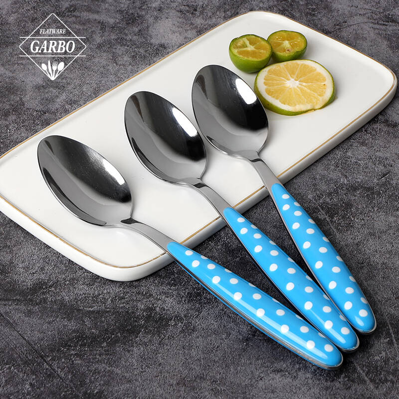 Clearance sale cheap price 6 pcs set dinner spoon plastic handle cutlery set stainless steel dinner spoon set. MOQ flexible for international orders and custom logo available for private label brands.